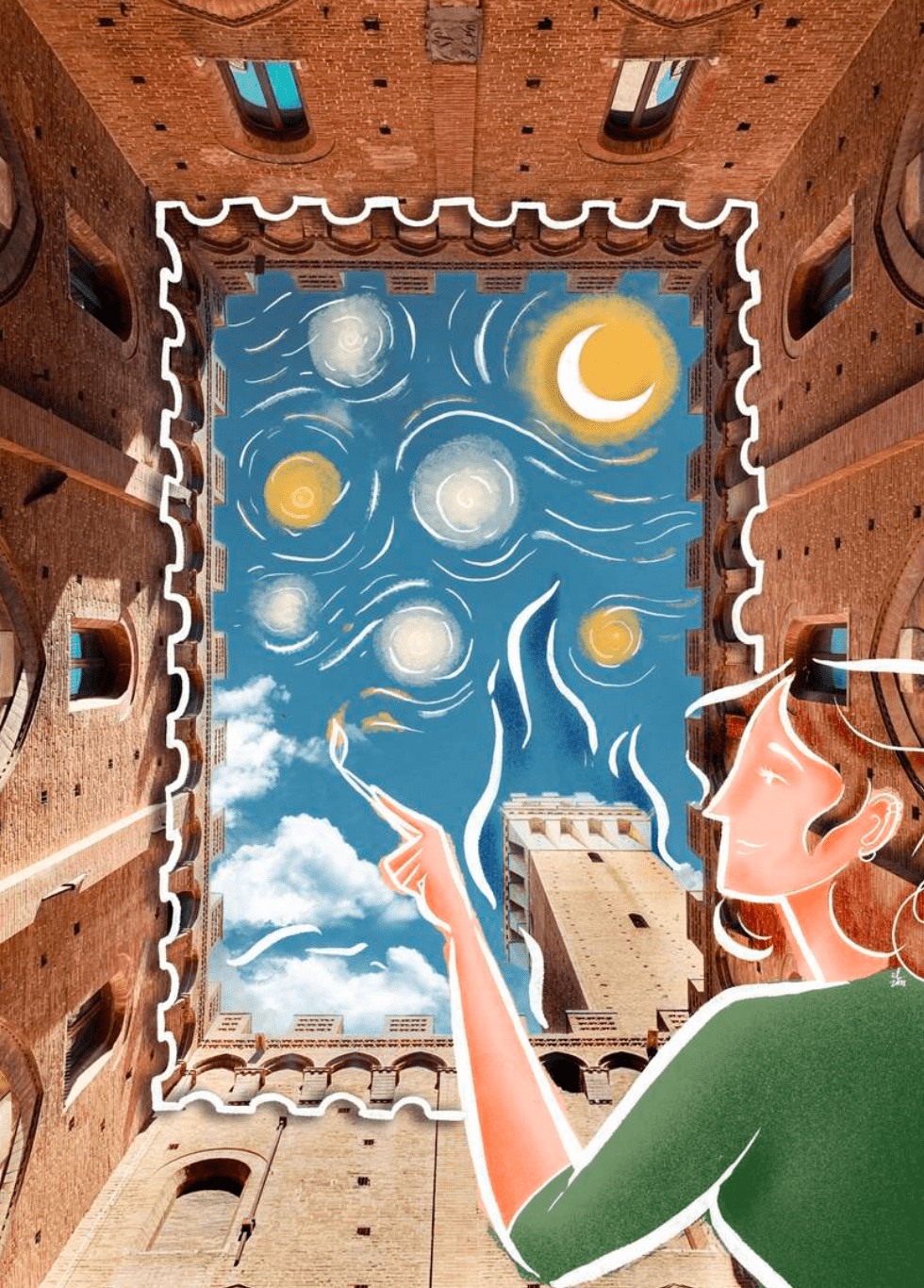 Elisa, laureata in ingegneria edile, una mattina mentre studiava per i suoi esami e si stava preparando una tazza di caffè, ha pensato forse avrebbe dovuto immergersi in quella tazza per riuscire a svegliarsi davvero. Così, per caso, ha scattato una fotografia alla tazza di caffè e si è disegnata al suo interno. In questo modo inatteso è scaturita la sua carriera da illustratrice. Nel tempo si è formata e il suo stile è evoluto, ma l’unione delle sue passioni offre oggi la possibilità di avere un contenuto creativo davvero particolare.