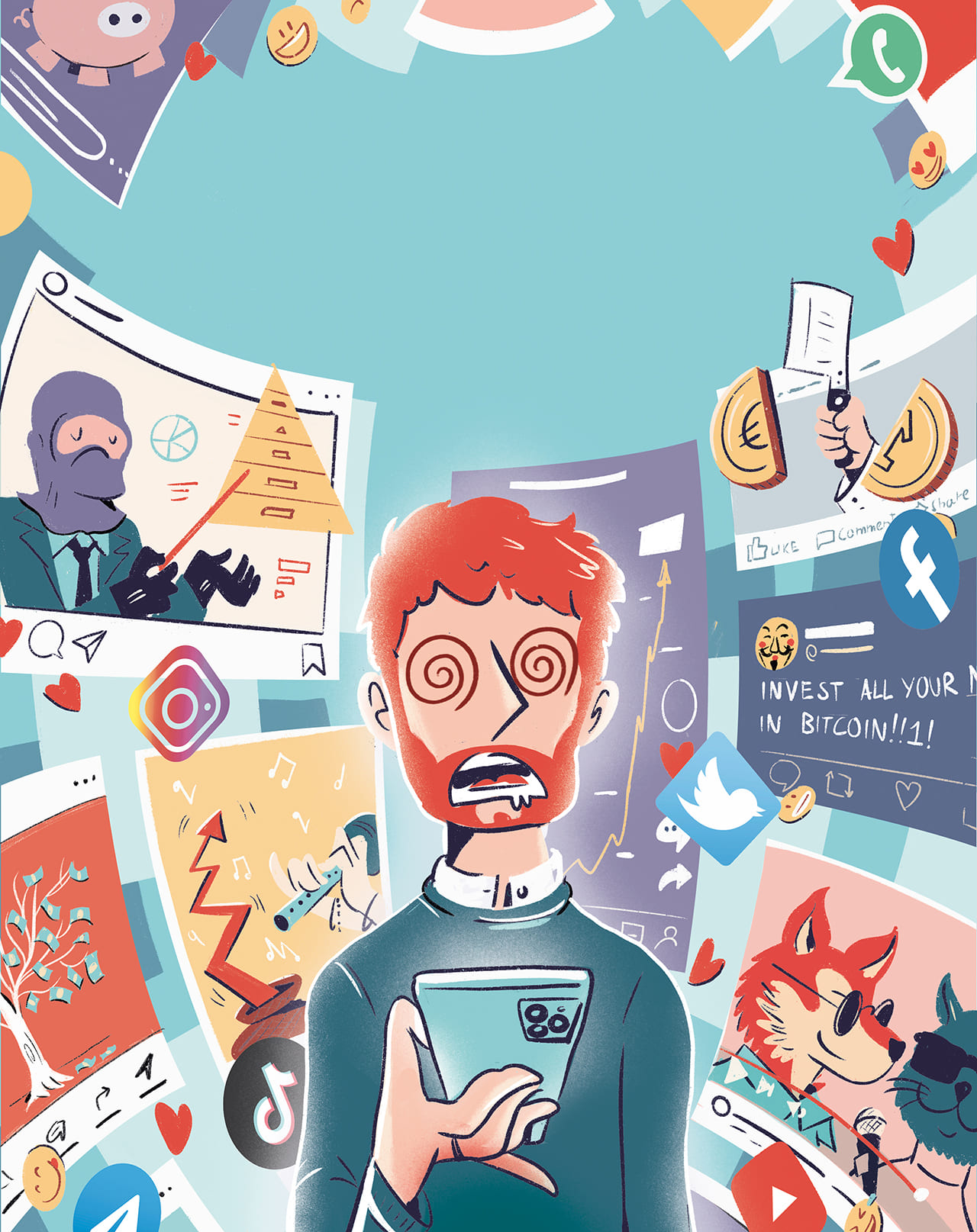 Illustrator and cartoonist, Giovanni graduated from IED Turin in 2017 and lives in the hills and mountains of Piedmont. His works tell his worldview and focus on economics, politics, food and lifestyle. His stroke is always in search of perfection and is characterized by irony, lightness and simplicity.