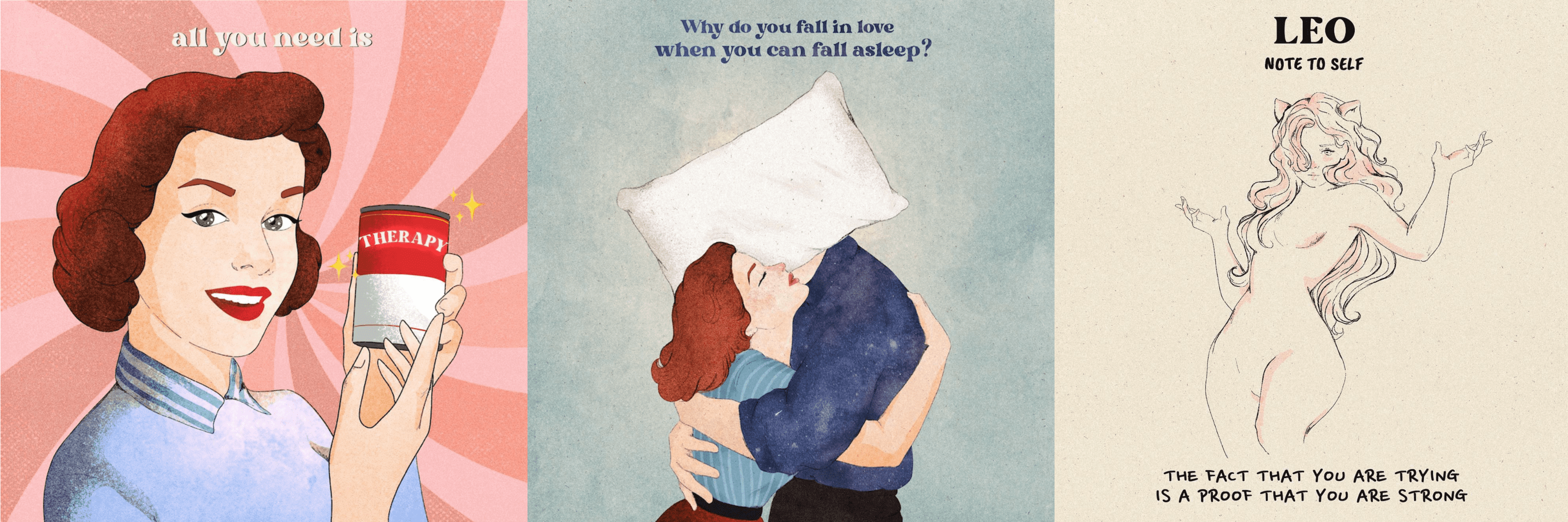 She likes to get intimate with the subjects she illustrates, mainly relationships, mental health, emotions, and this has allowed her to build a close-knit community, especially on Instagram. This is the social media to which she devotes the most content and attention, and she has created many communication formats, some of which are very popular today.