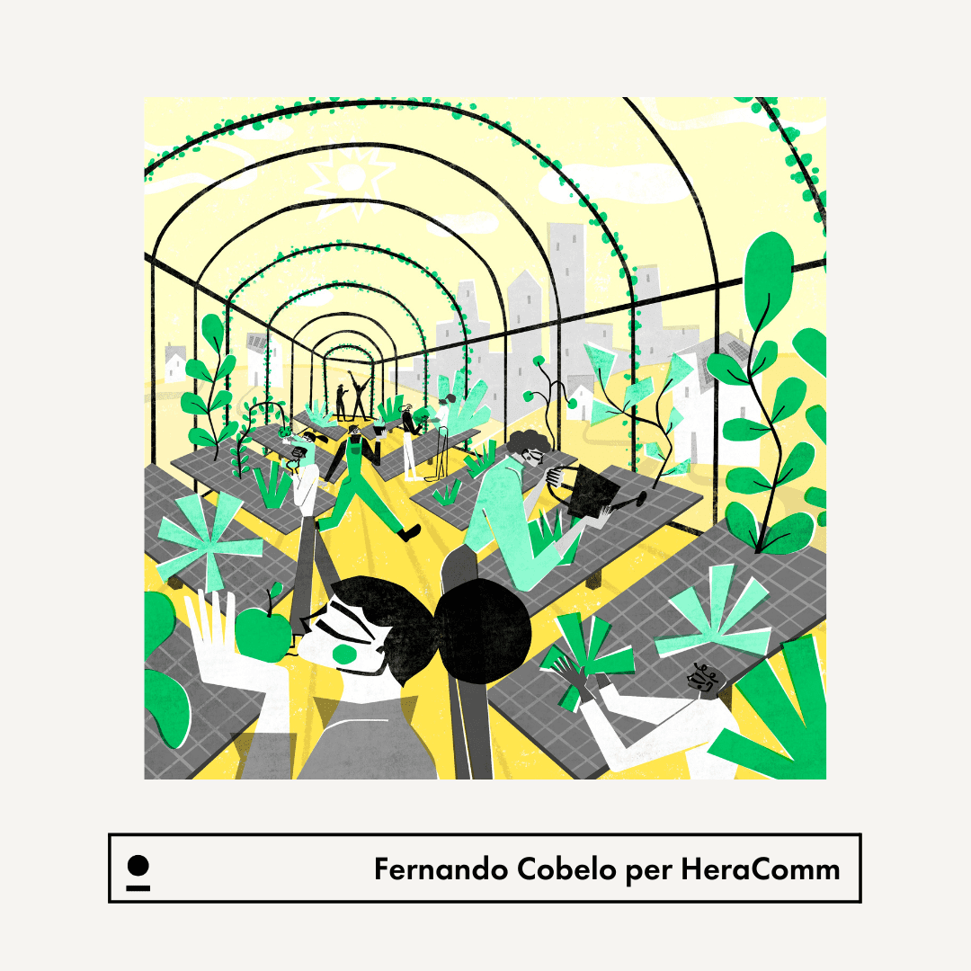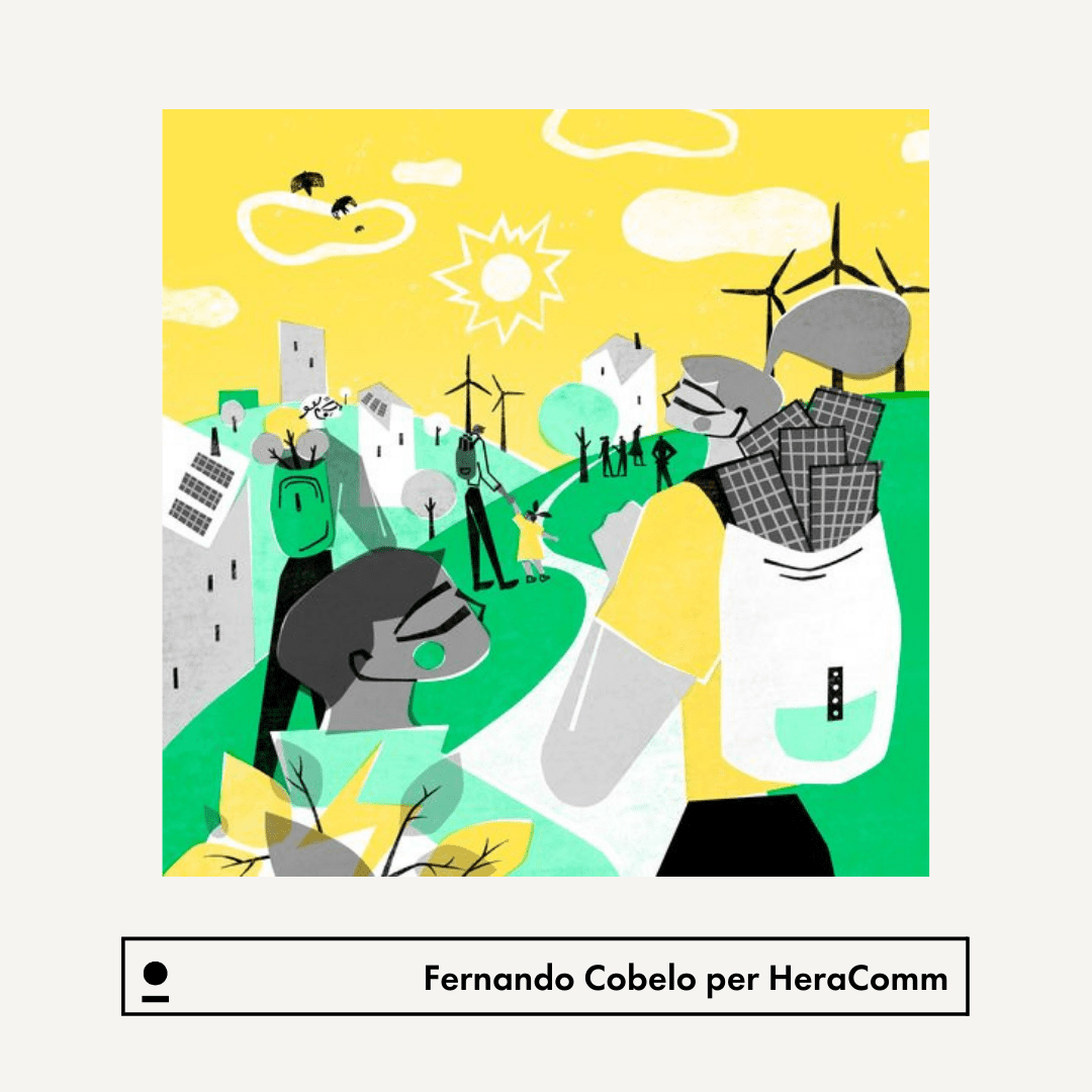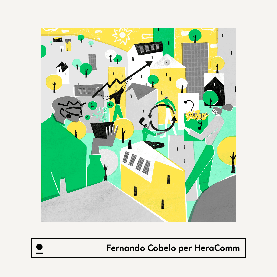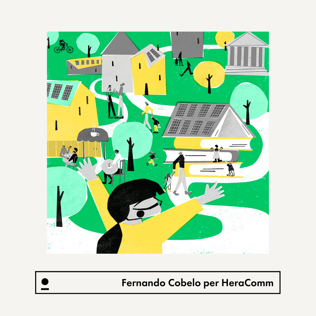 Fernando Cobelo interprets energy communities for Hera Comm, visually portraying how energy independence of groups of houses through sustainable energy sources can bring benefits. The illustrated content was used for the company’s communication channels, primarily the website.