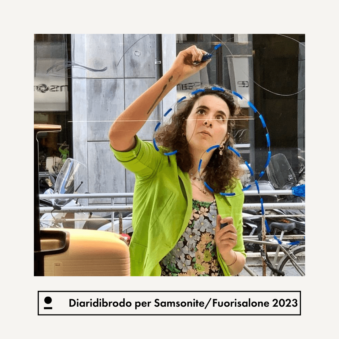 Fuorisalone 2023: Diari di Brodo customized, during a live performance, the shop window of the Samsonite store in Milan on via S. Pietro all’Orto.