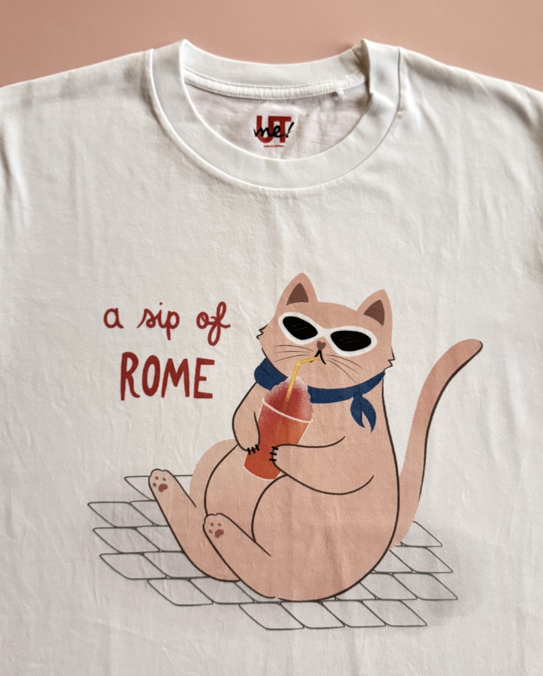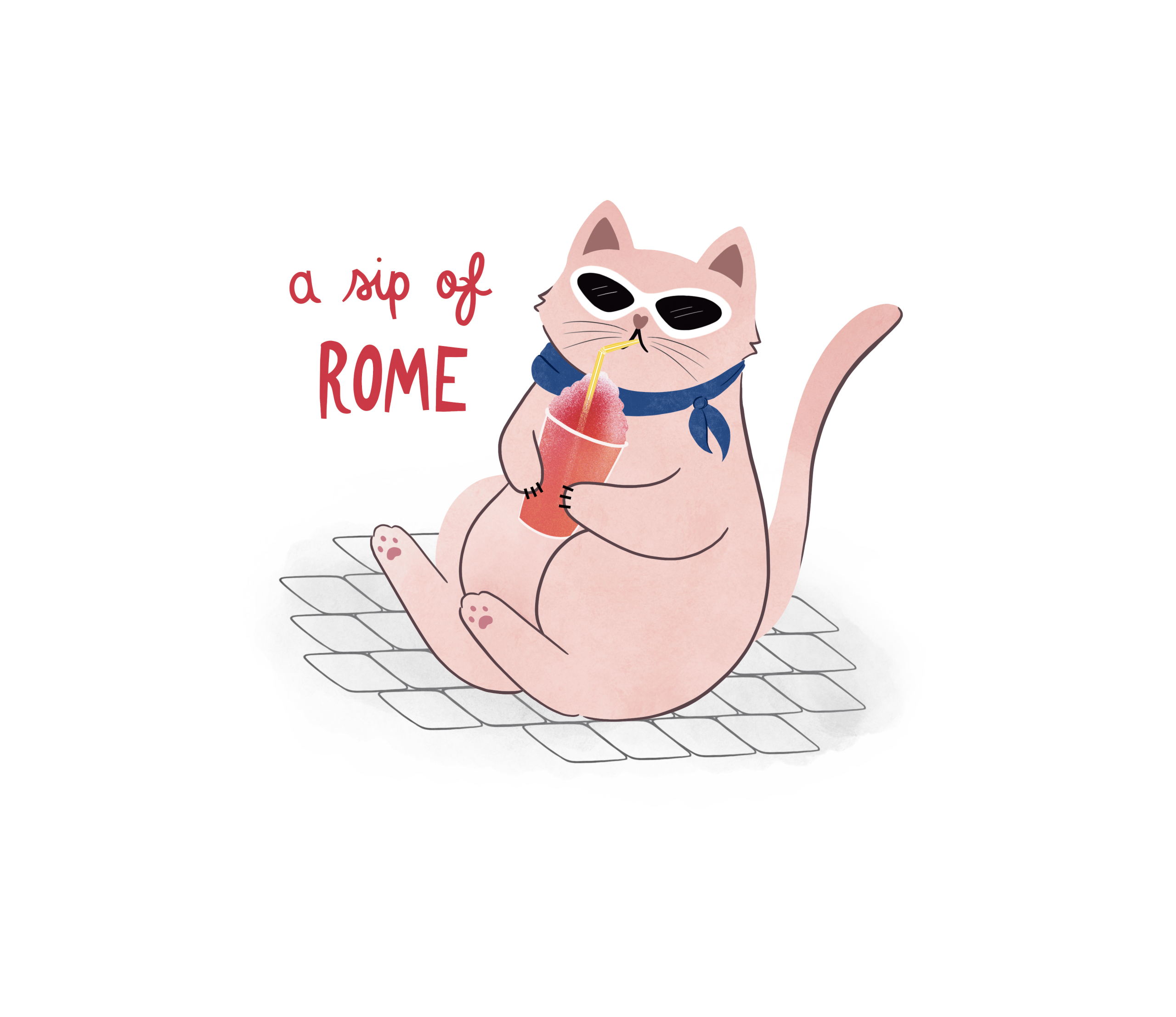 Creative concept: Pollaz developed the concept of “illustrated Romanity,” interpreting the iconic symbols of Rome in a contemporary and playful way. The result? Cats sharing a supplì, sipping a grattachecca, and a bunch of smiling artichokes.