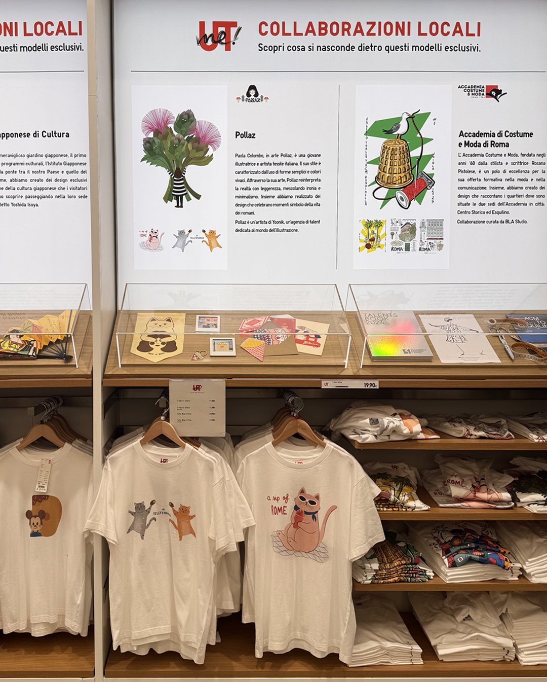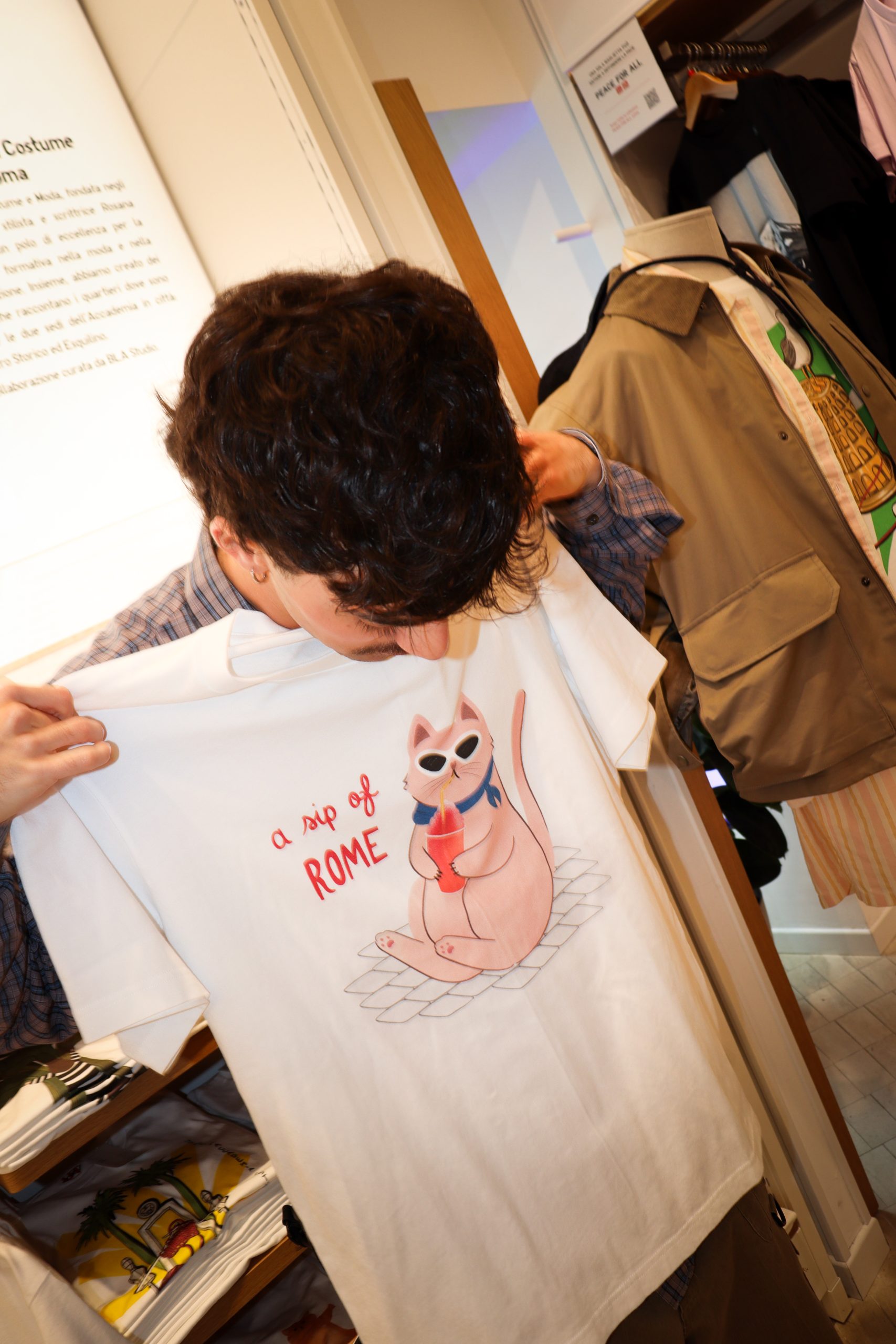 Authentic local connection: Pollaz’s illustrations offered a fresh and unexpected interpretation of Roman culture, loved by the local public. Each embroidery transformed a Uniqlo product into a unique piece, imbued with memories and affection for the city.