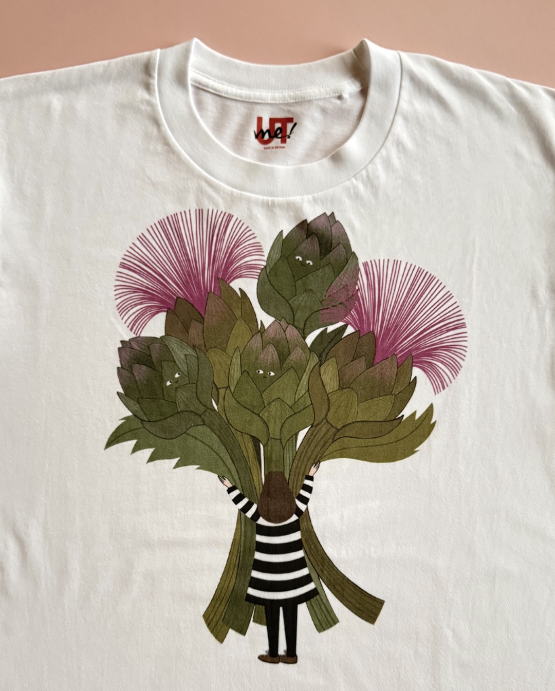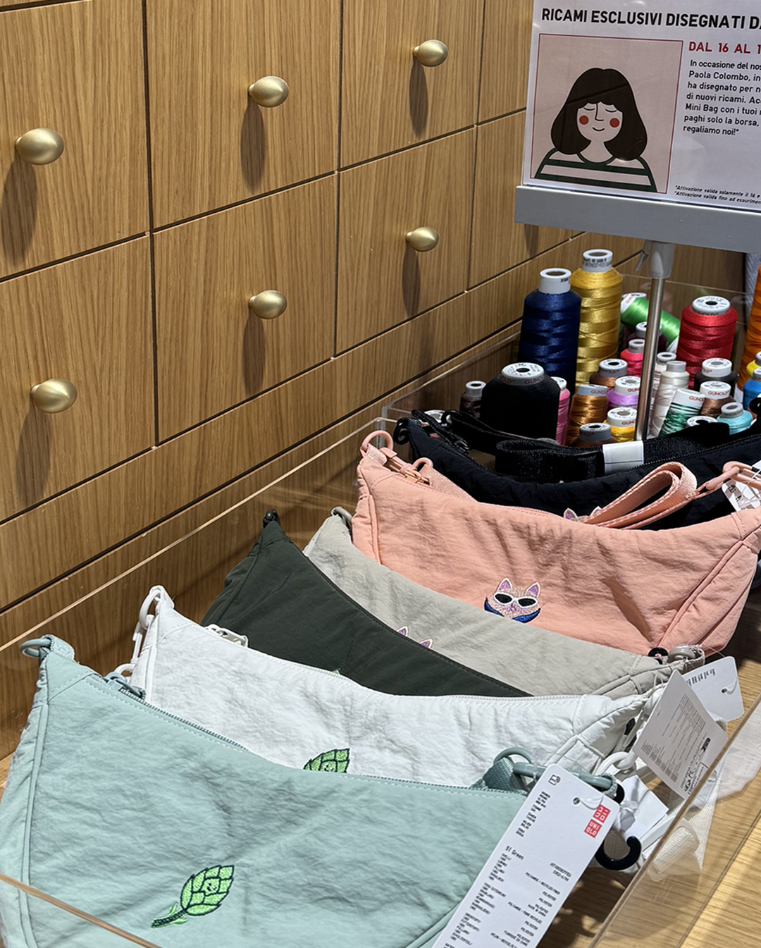 In-store customization experience: The illustrations were at the heart of a unique experience offered to store customers. People were able to purchase the illustrated garments and customize their purchases with Pollaz’s designs in a particularly popular way: by having the kittens and artichokes embroidered on Uniqlo’s iconic shoulder bag.
