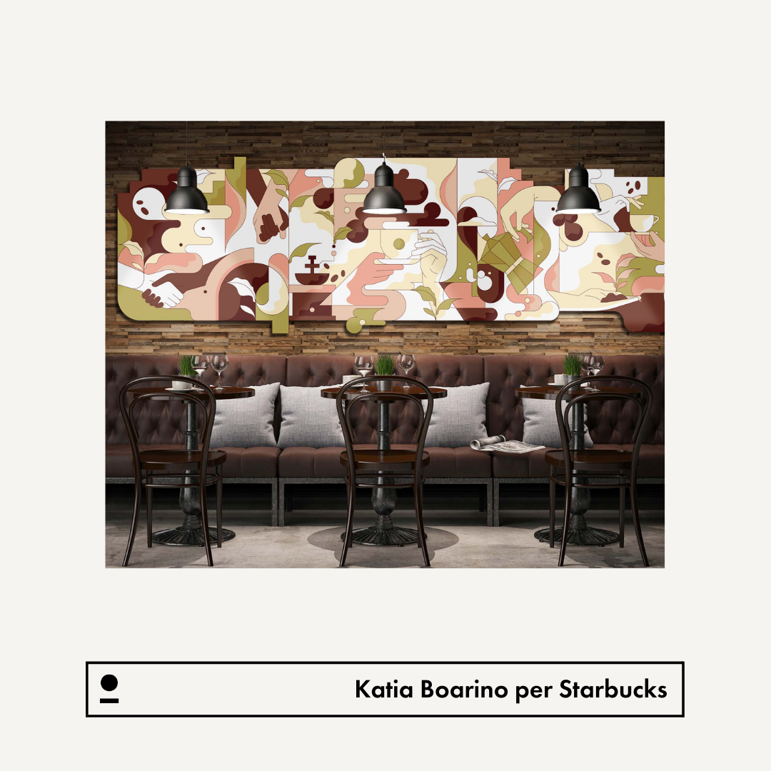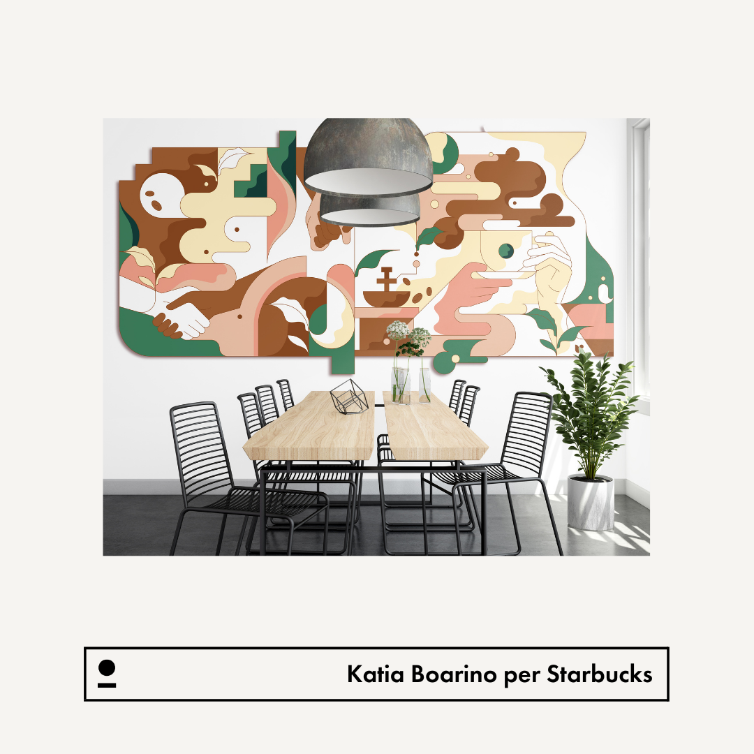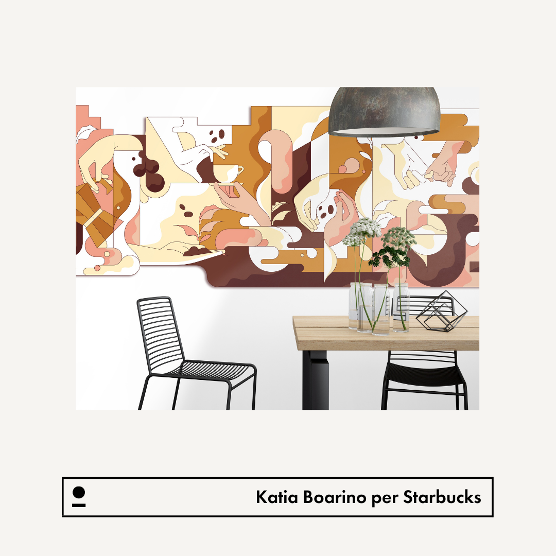 Katia Boarino took part to Starbucks Art Program and created some artworks that have been used to decorate the interior walls of Starbucks stores. The theme that inspired the creation of the illustration is the culture of coffee in Italy. A visual narrative that unravels among the tools and gestures that accompany this essential ritual for many of us.