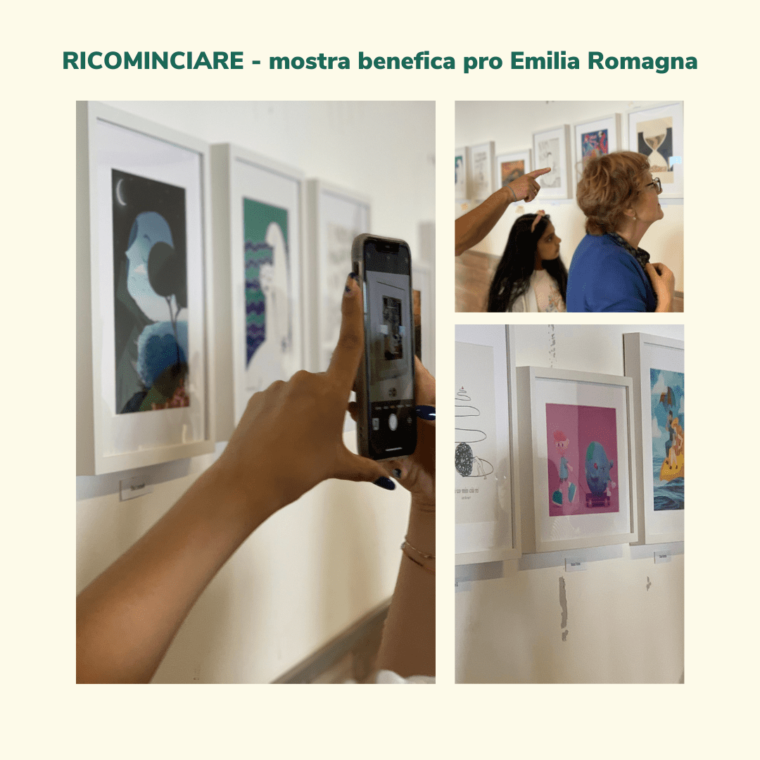 Finally, the inauguration of RICOMINCIARE, a pro-Emilia Romagna exhibition on display until the end of July at the Casa del Parco Adamello. 20 Italian illustrators donated illustrated works for a charity sale, the proceeds of which were donated to “La Vecchia Faenza”, a small workshop that makes majolica decorated in the traditional Faenza style and that was unfortunately destroyed in the emergency that hit the region.”