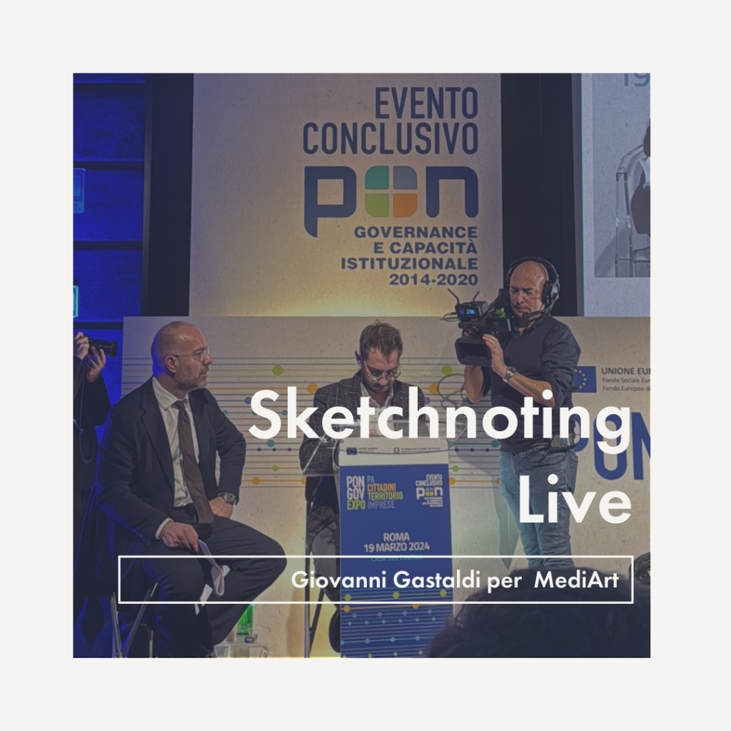 Cliente: MediArt. Stili: Illustration, Sketchnoting live Concept: PON, Governance e capacità istituzionali Illustratore: @giovanni.gastaldi Contenuti: Giovanni ha realizzato diverse illustrazioni in modalità sketchnoting live durante l’evento istituzionale PON Governance alla Casa del Cinema a Roma. Le sue illustrazioni sono state proiettate e utilizzate per riassumere e schematizzare gli argomenti trattati durante la conferenza.