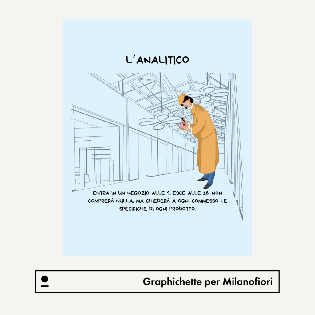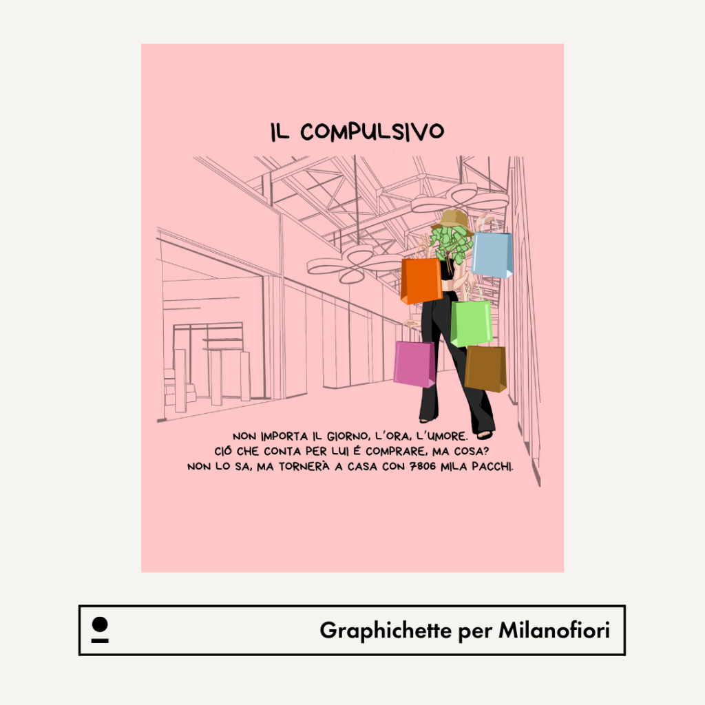 Cliente: @centromilanofiori Stili: Illustration, Social Media Concept: Dimmi come ti comporti nel centro commerciale e ti dirò chi sei. Illustratrice: Gra.phichette Contenuti: ambientate all’interno del centro commerciale, le sei creatività realizzate raccontano con un pizzico di ironia caratteristiche, piccole manie e dettagli di sei tipologie diverse di clienti.